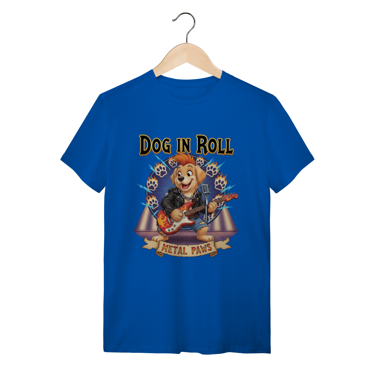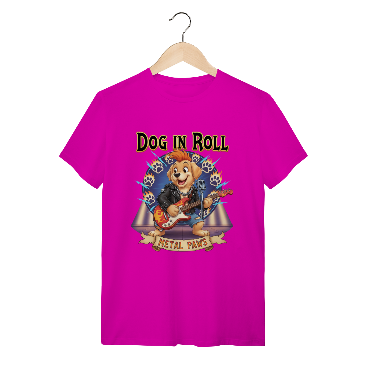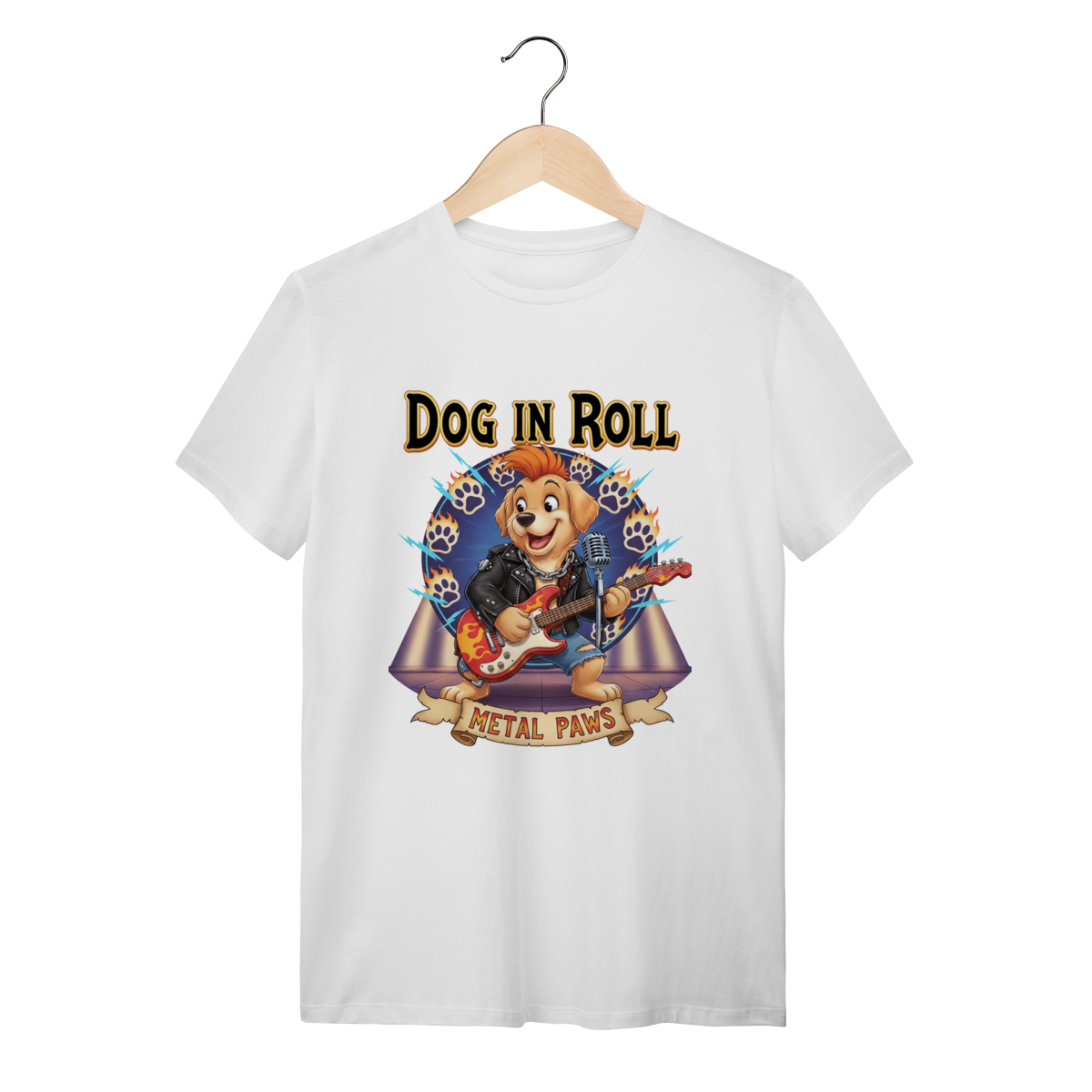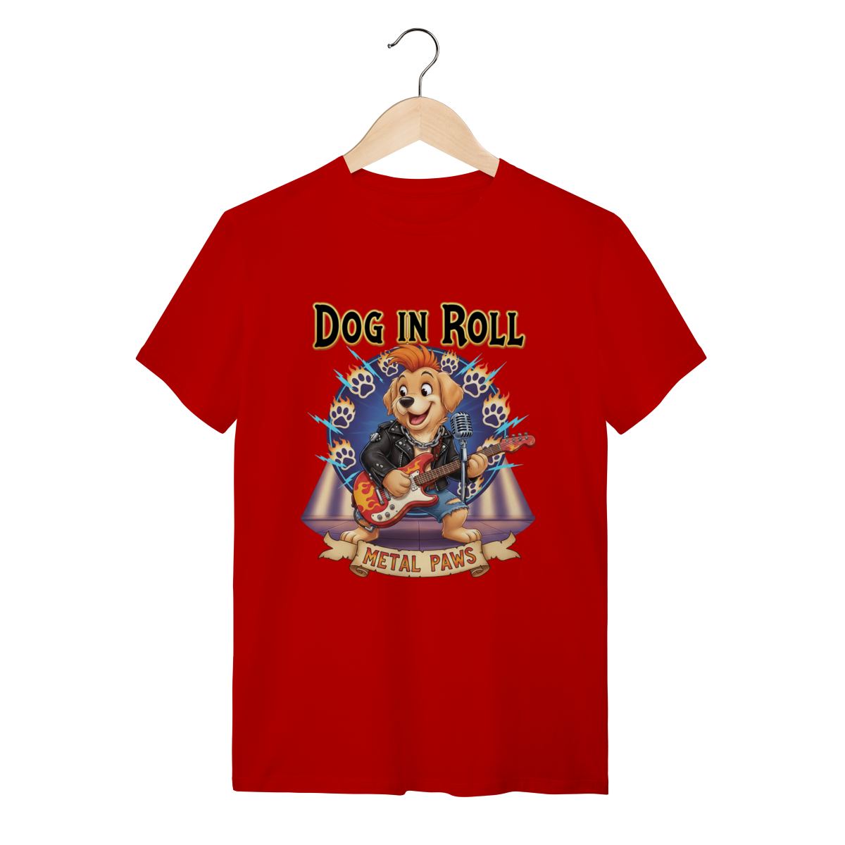 A Estrela do Show: Metal PawsNesta estampa exclusiva, trazemos um cachorro guitarrista cheio de atitude, pronto para um solo incrível. Com jaqueta de couro e guitarra em chamas, ele representa aquele seu pet que é o verdadeiro rockstar da casa. O fundo vibrante completa o visual cheio de energia.