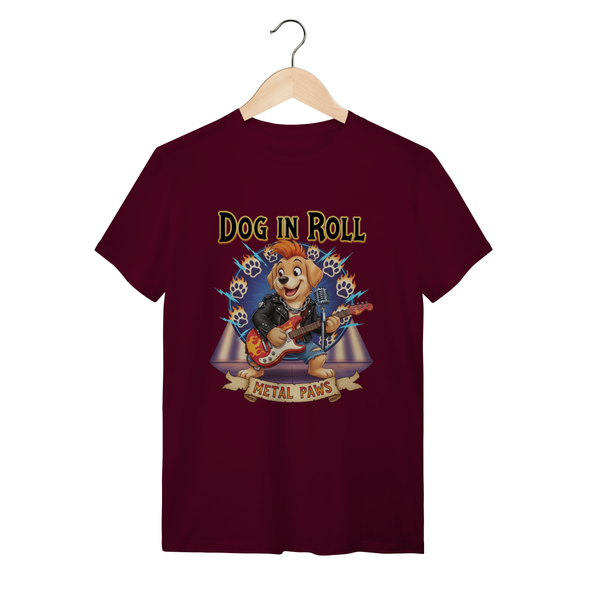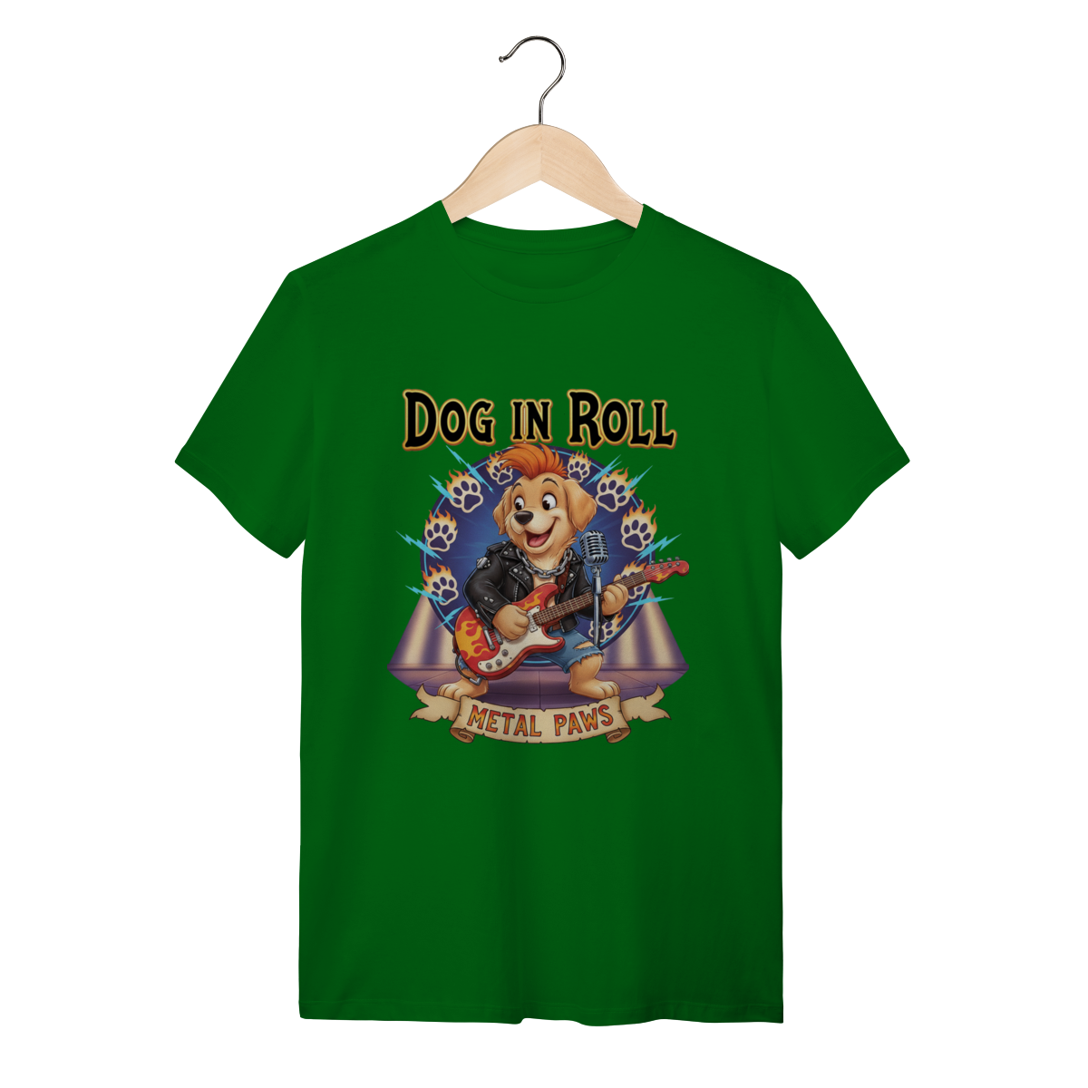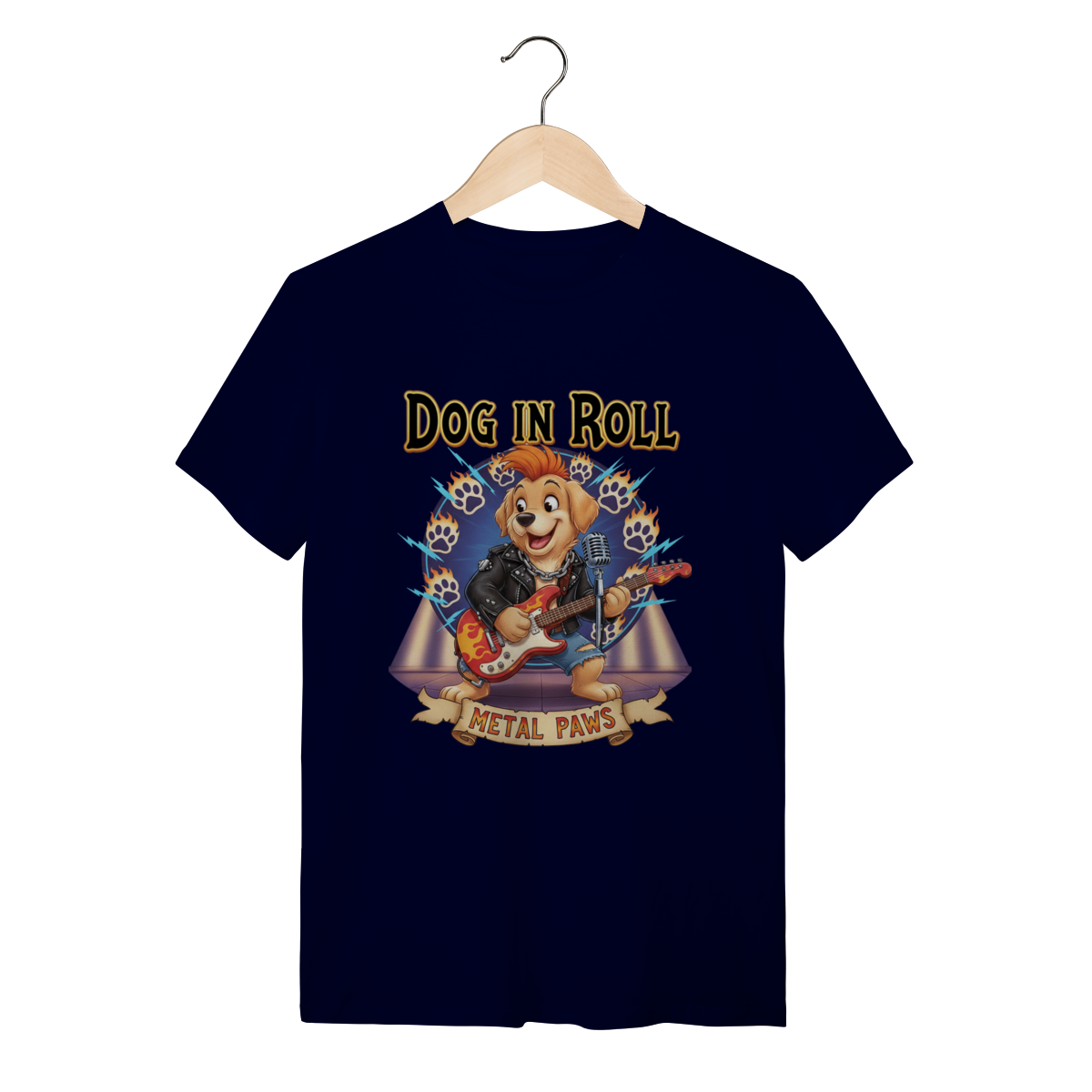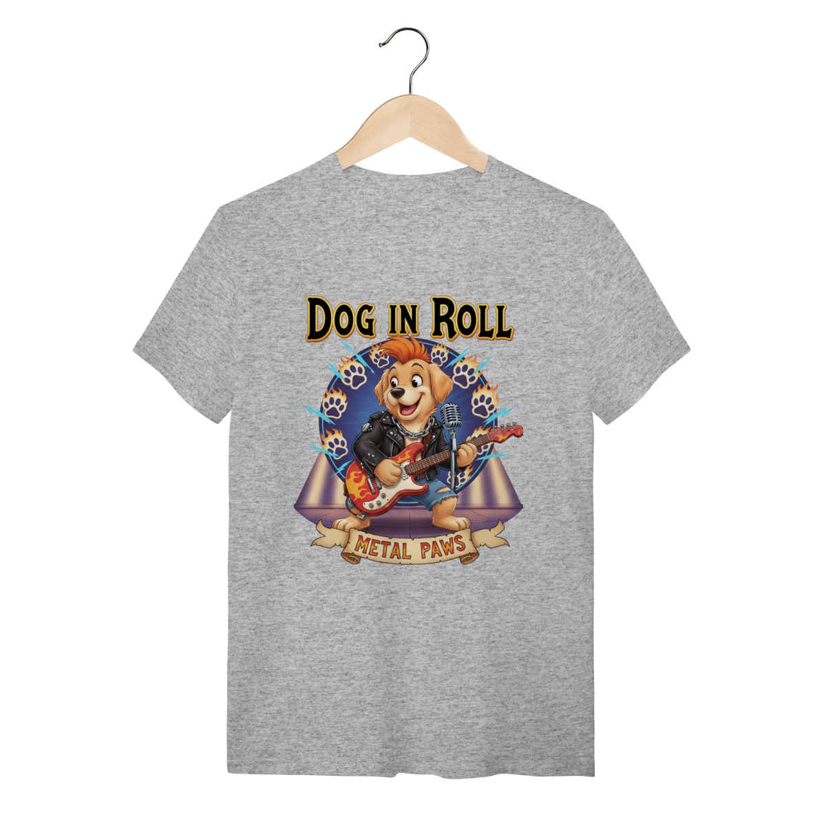 A Estrela do Show: Metal PawsNesta estampa exclusiva, trazemos um cachorro guitarrista cheio de atitude, pronto para um solo incrível. Com jaqueta de couro e guitarra em chamas, ele representa aquele seu pet que é o verdadeiro rockstar da casa. O fundo vibrante completa o visual cheio de energia.