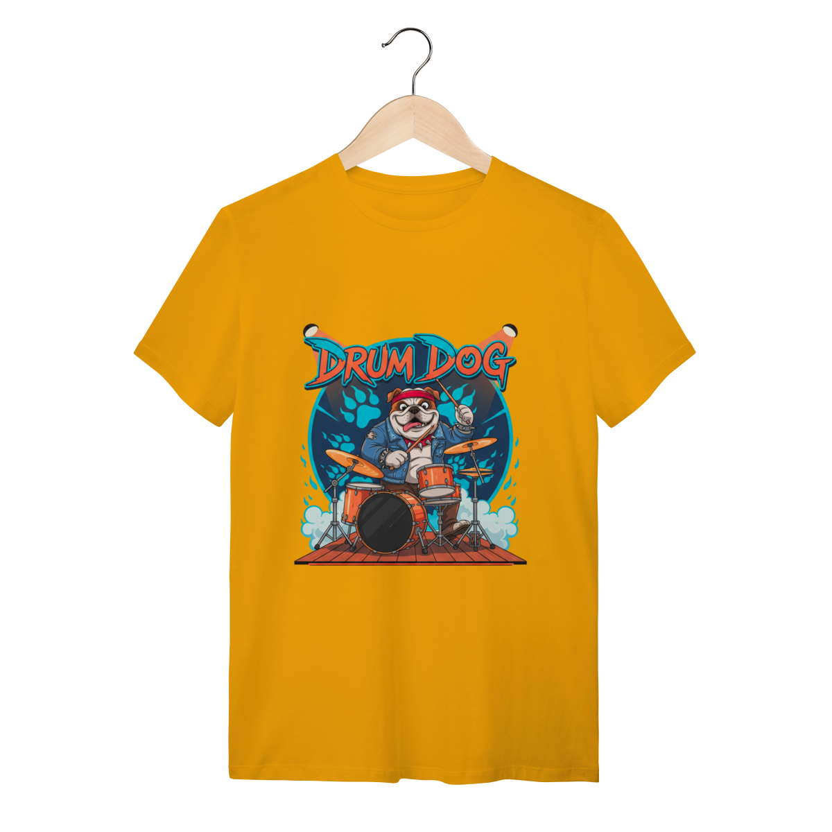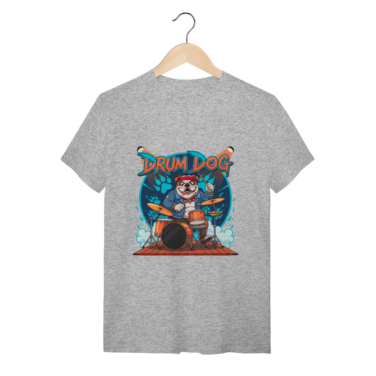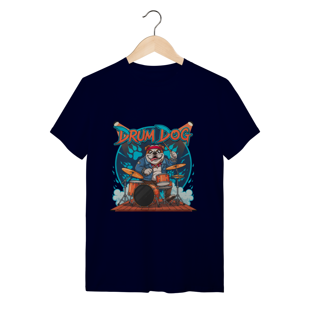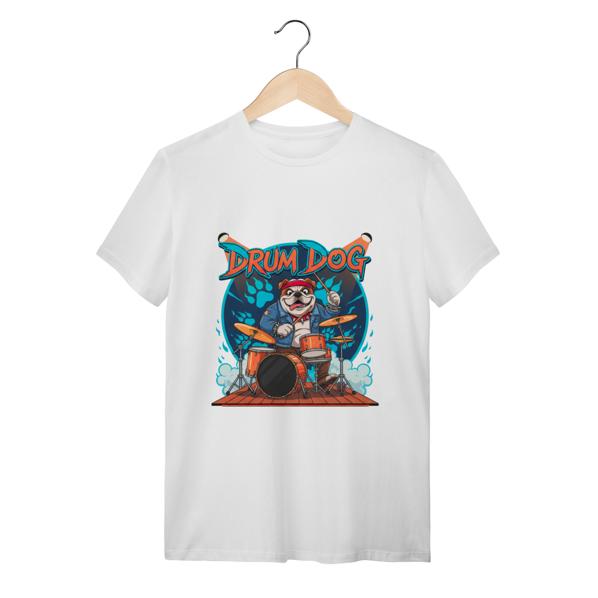 Esta peça exclusiva da coleção Pets Rock traz um Bulldog Inglês cheio de garra, dominando as baquetas em um solo épico sob os holofotes. É a escolha perfeita para quem busca uma camiseta personalizada de cachorro que une paixão pela música e design de alta qualidade.