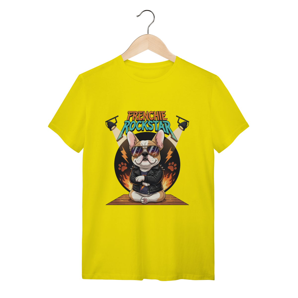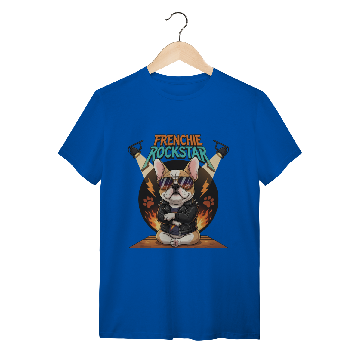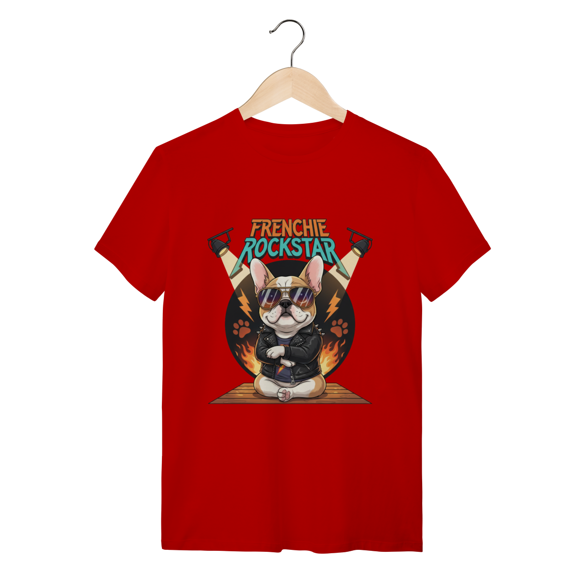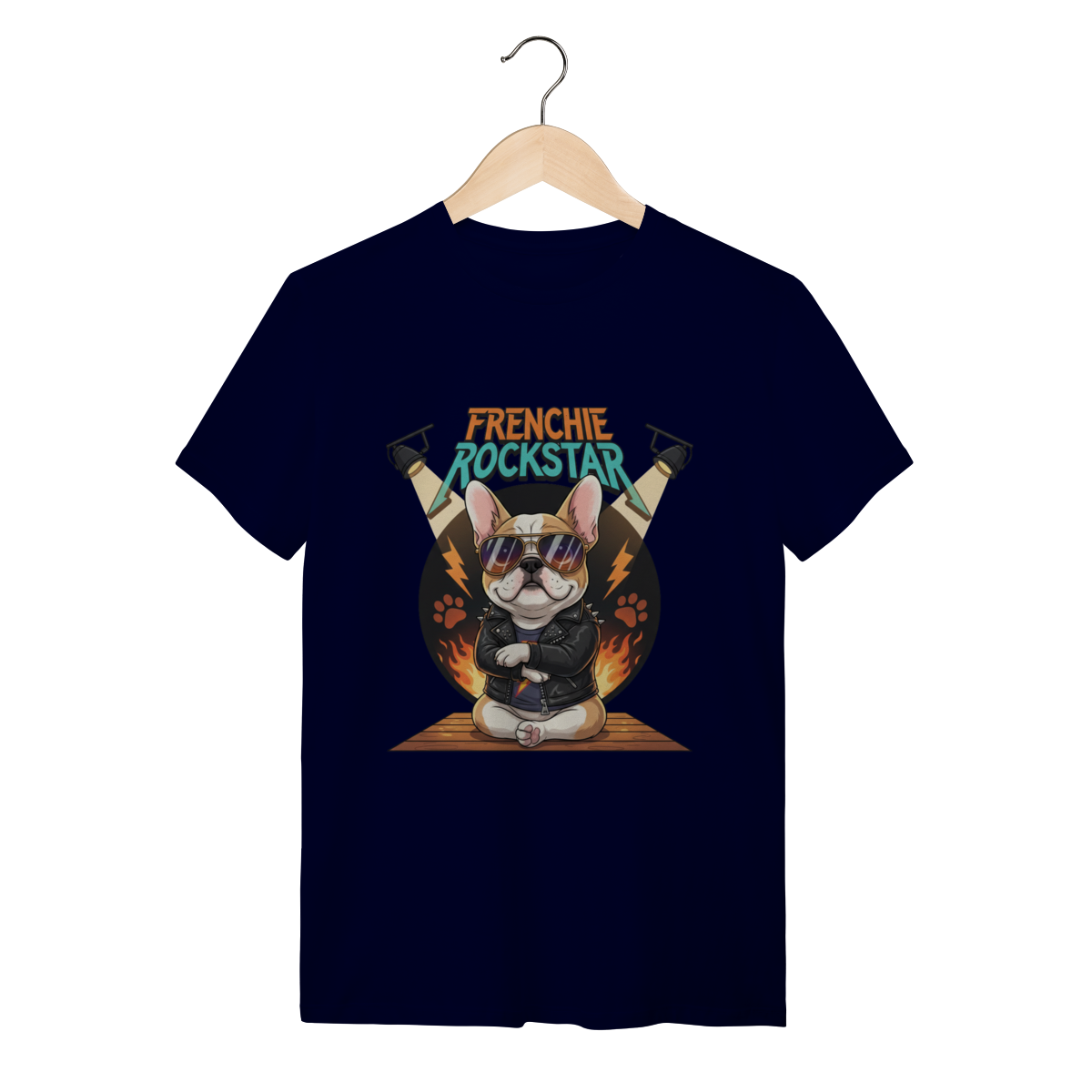 A Camiseta Frenchie Rockstar traz um Bulldog Francês com jaqueta de couro e óculos escuros, ideal para tutores que buscam uma camiseta personalizada com estilo moderno e alma rockeira.