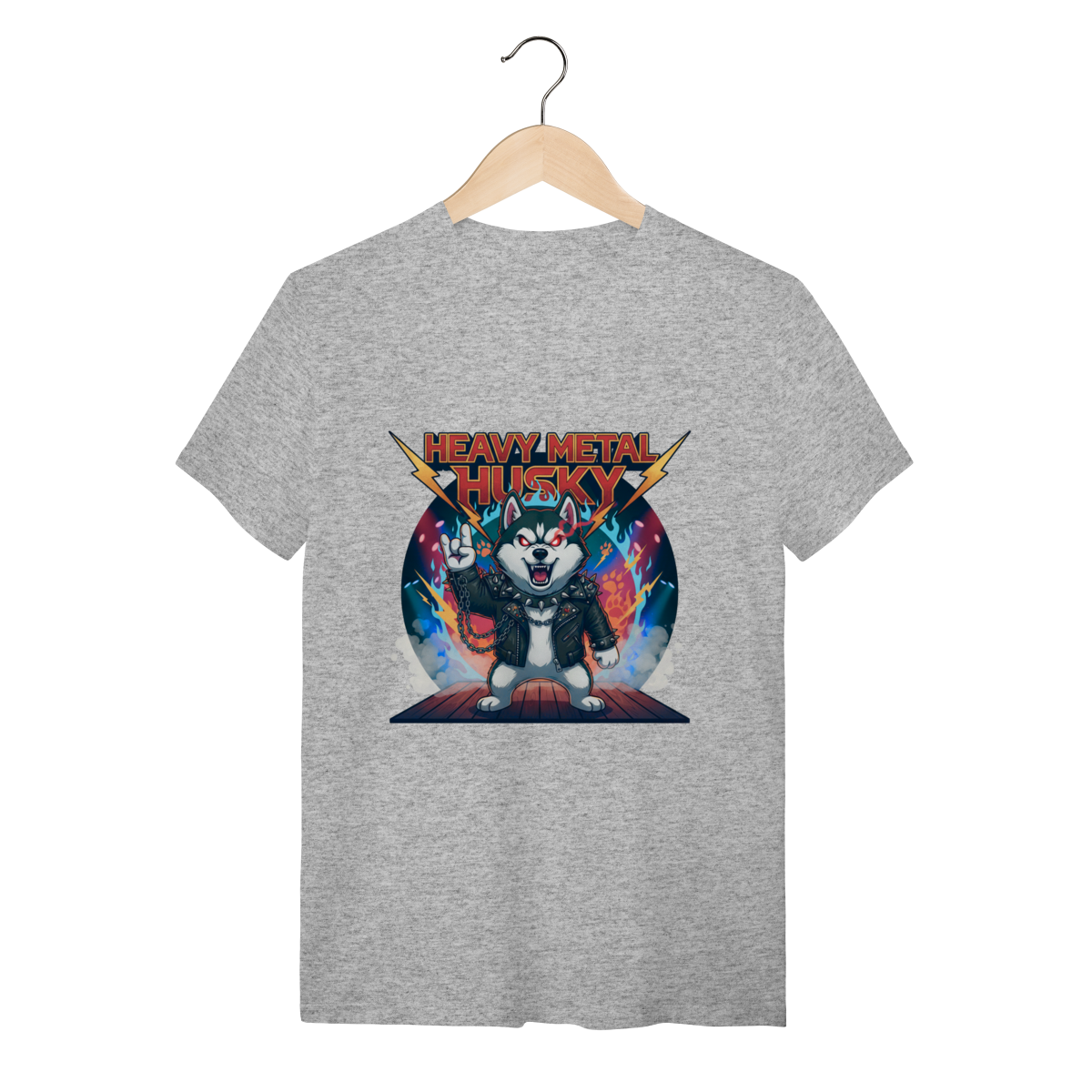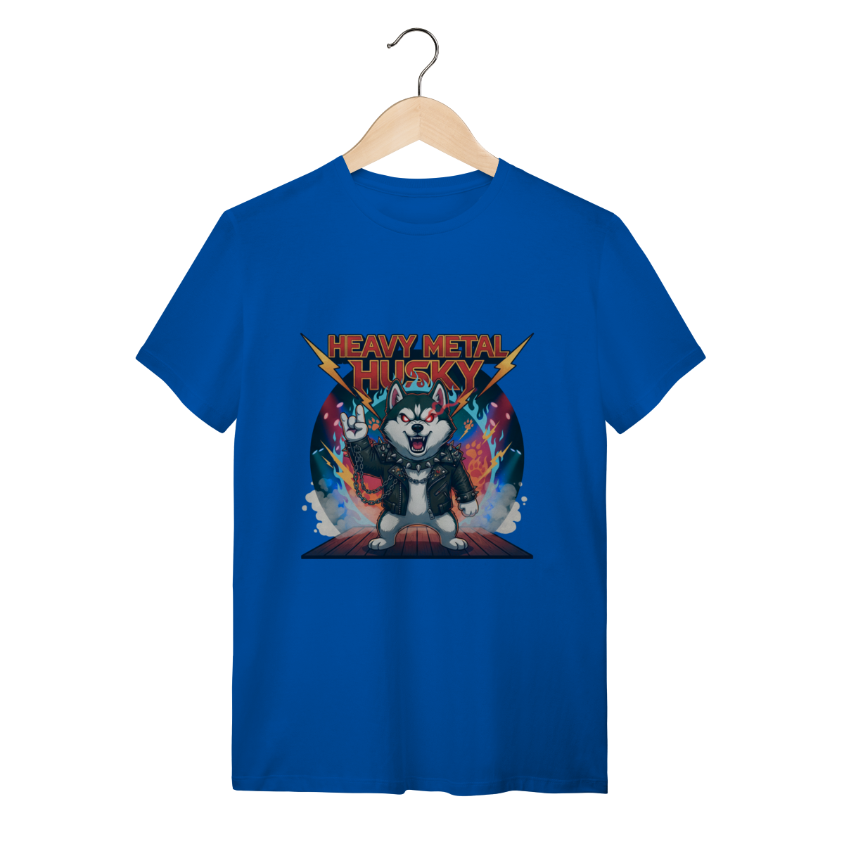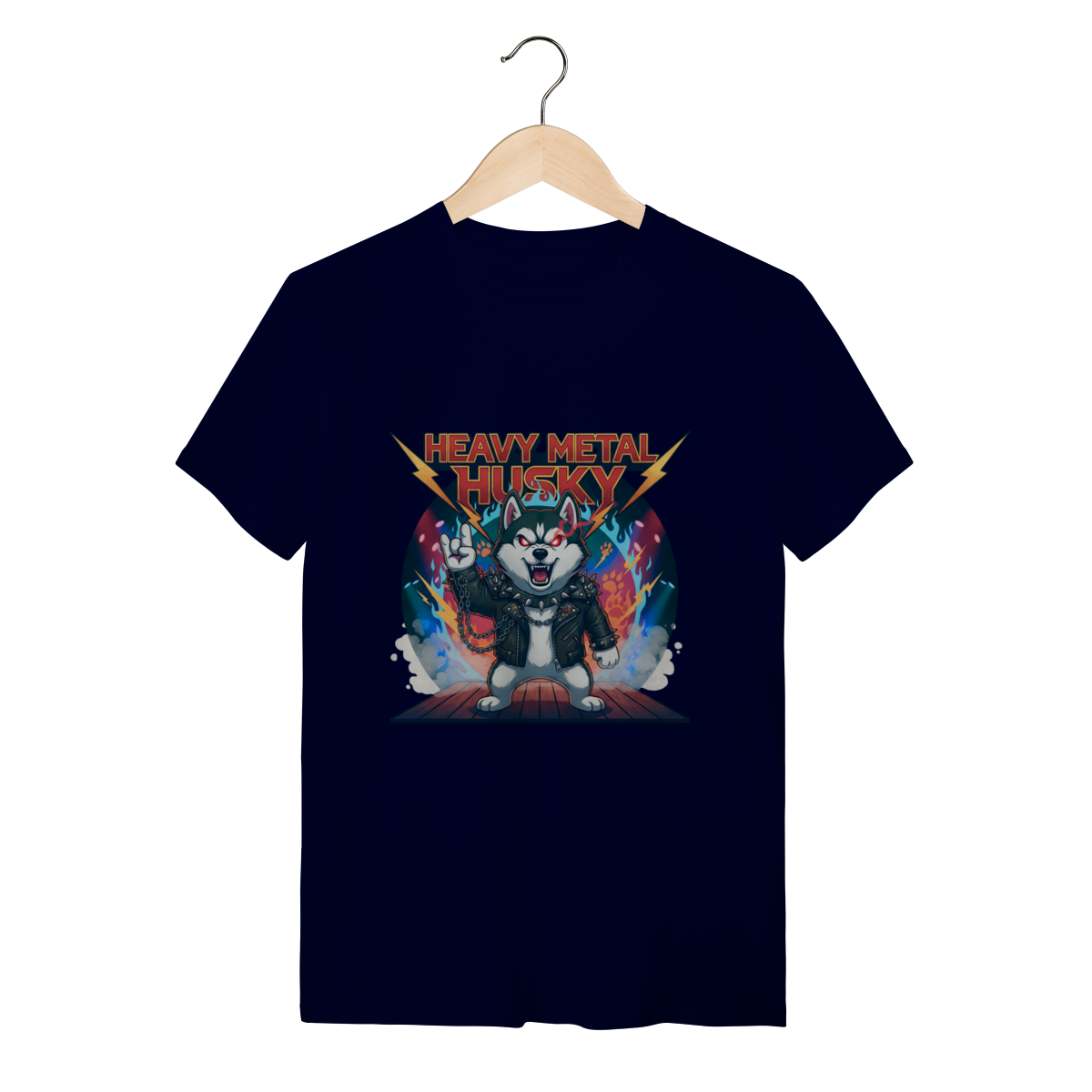 A Camiseta Heavy Metal Husky traz a força e o olhar intenso do Husky Siberiano em uma versão metaleira definitiva, com jaqueta de couro, correntes e chamas. Ideal para quem busca uma camiseta personalizada de Husky com alma rebelde, estilo marcante e o conforto que sua rotina exige.