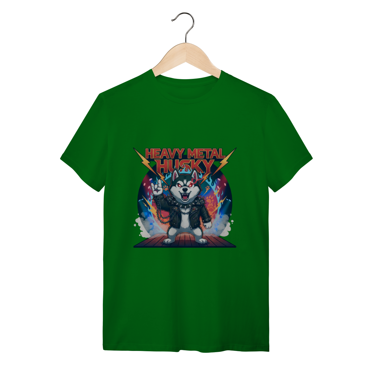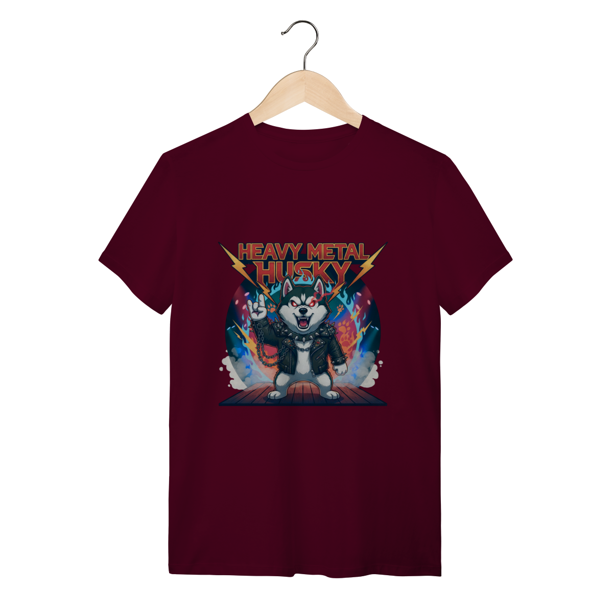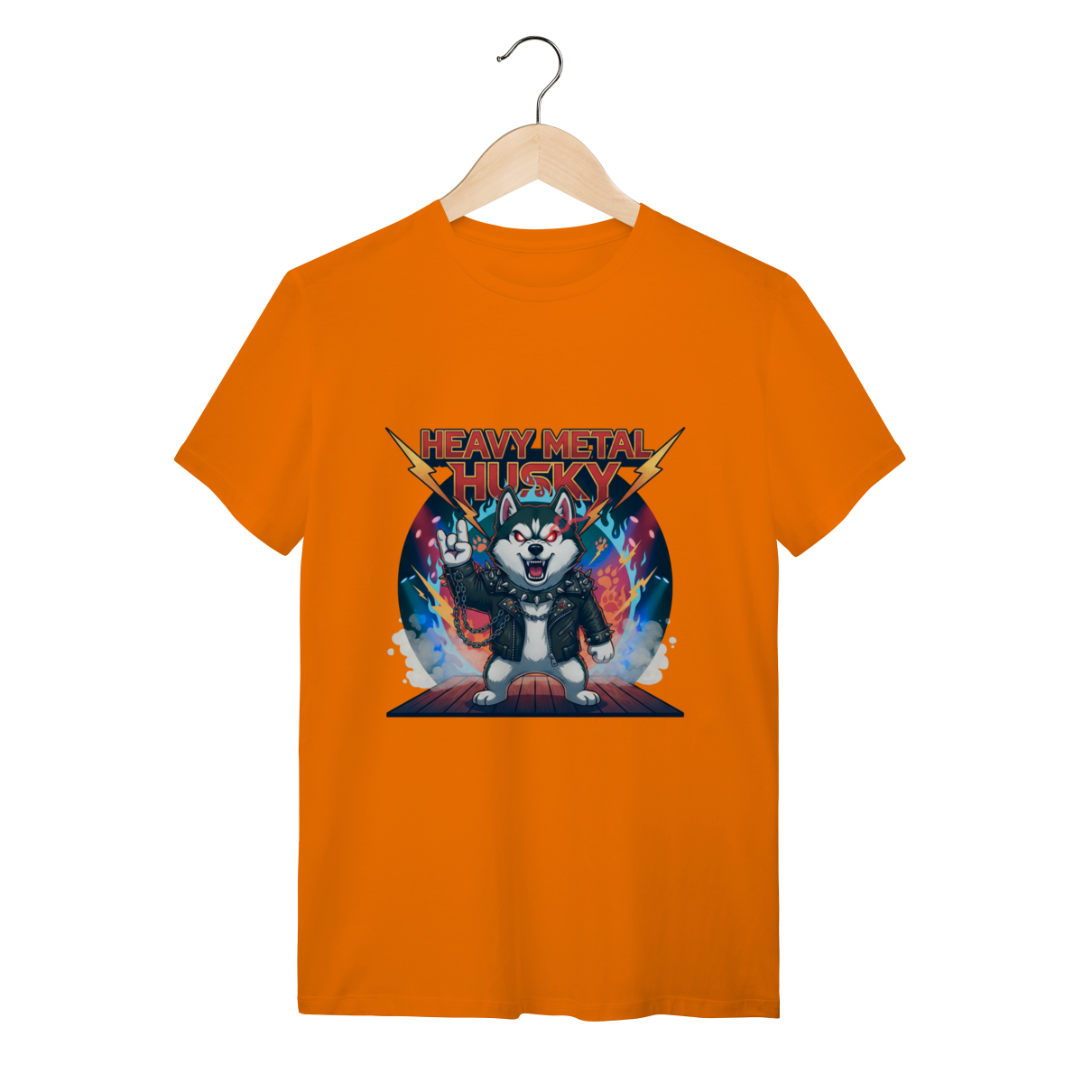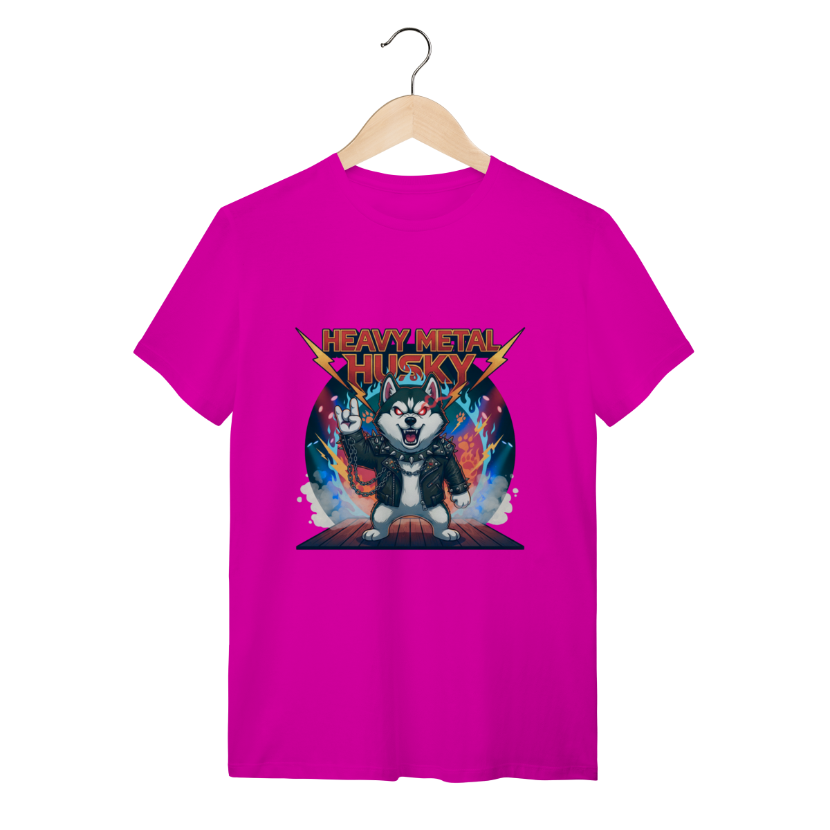 A Camiseta Heavy Metal Husky traz a força e o olhar intenso do Husky Siberiano em uma versão metaleira definitiva, com jaqueta de couro, correntes e chamas. Ideal para quem busca uma camiseta personalizada de Husky com alma rebelde, estilo marcante e o conforto que sua rotina exige.