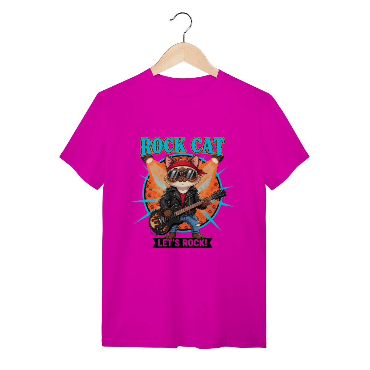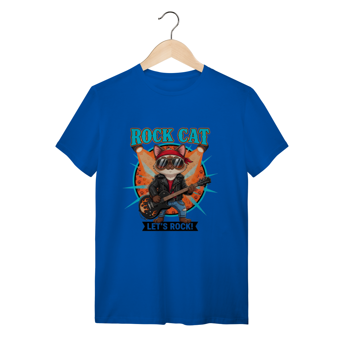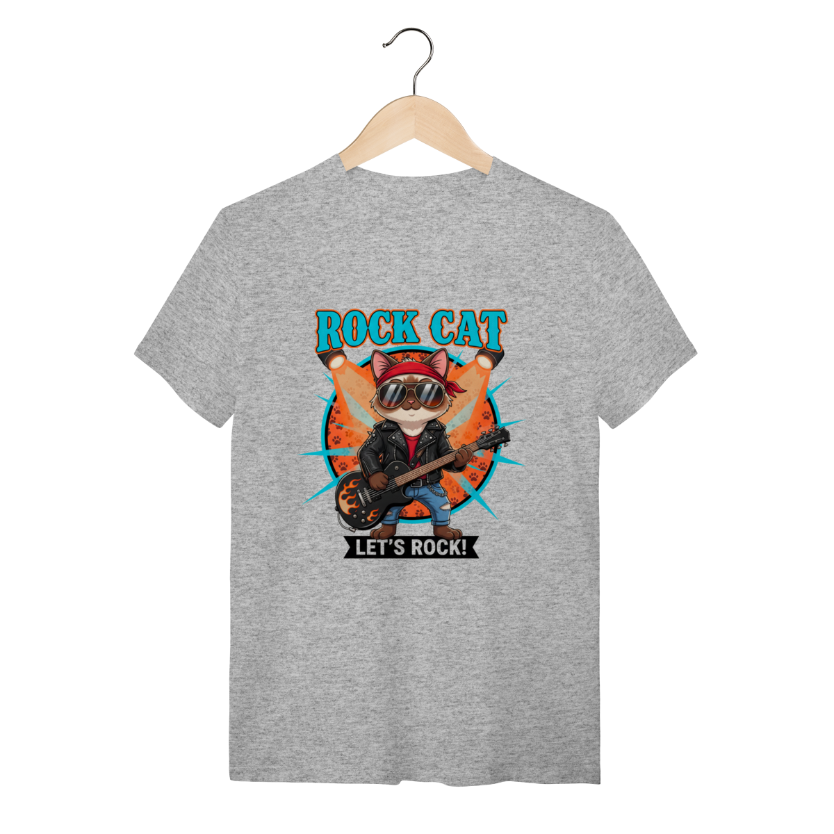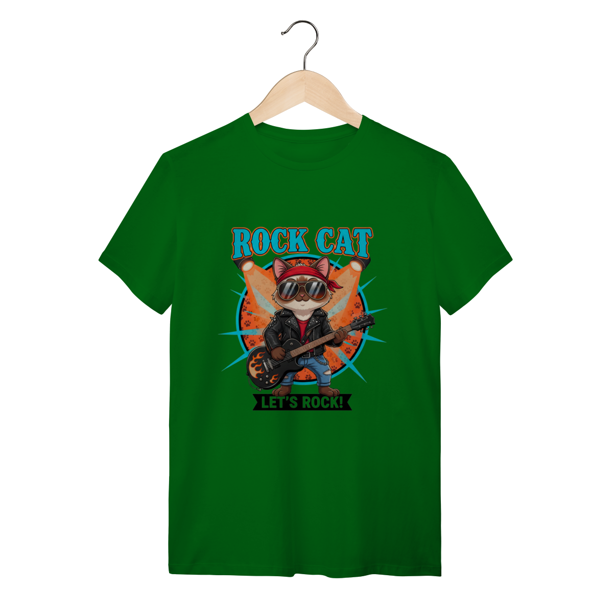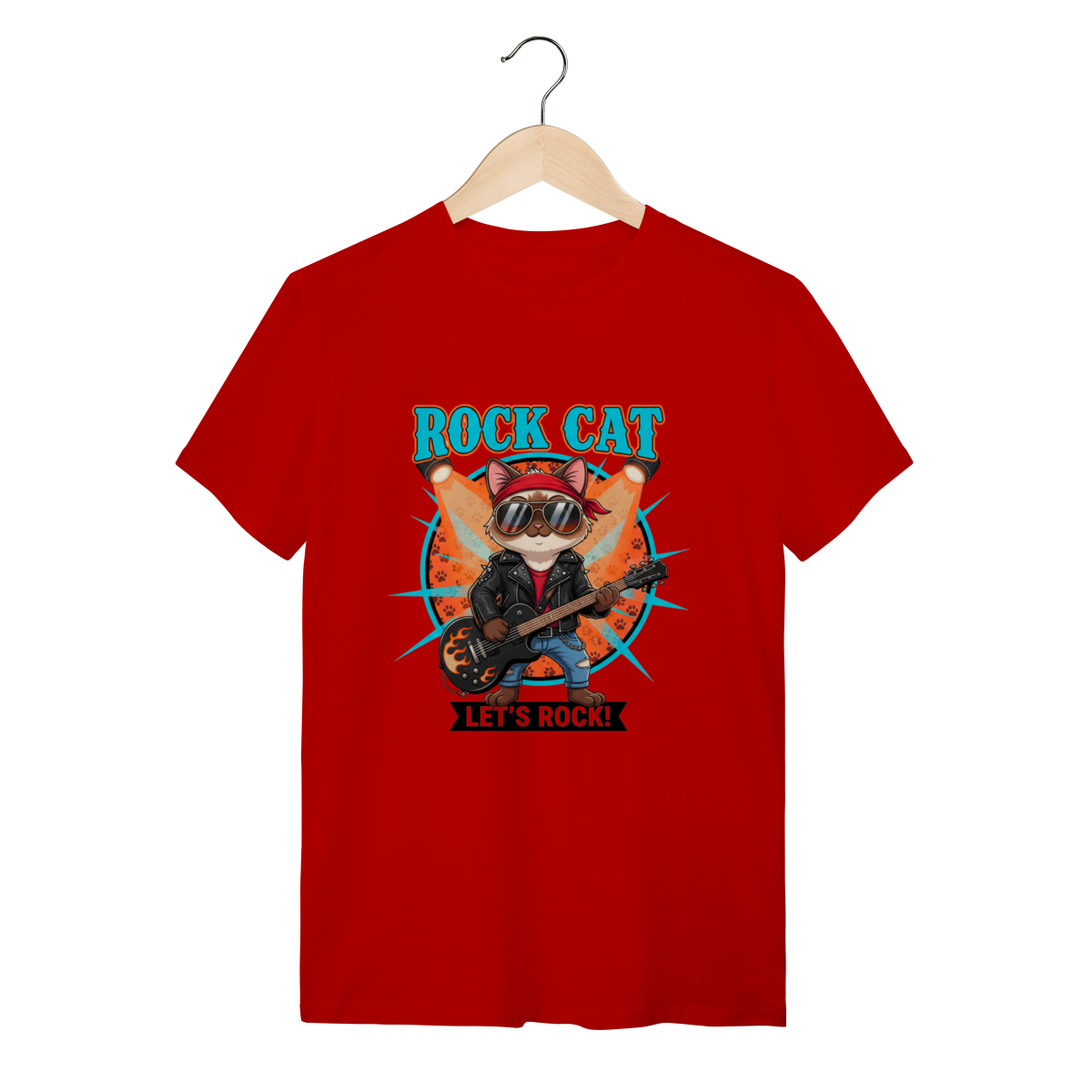 A Camiseta Rock Cat traz um gatinho cheio de atitude, usando bandana, óculos aviador e dominando a guitarra em chamas, ideal para quem busca uma camiseta personalizada de gato com alma rockeira.
